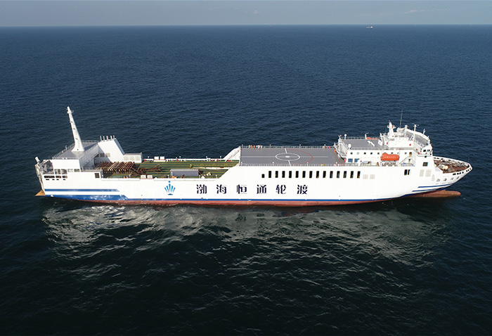 渤海輪渡多功能滾裝船總長189.9米,型寬26.4米,車道線2700米,總噸2.65萬噸,交付時是亞洲最大多用途滾裝船。該船為鋼質船體,雙槳雙軸推進系統,屬國內遠海航行的滾裝船。